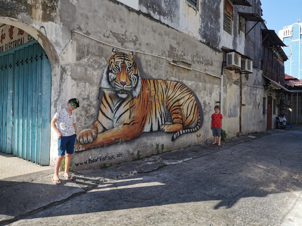 We arrived and went for a wander through the old town. I started off feeling uptight about the traffic, dirty streets, smells near the open drains etc but within 15 minutes I found myself letting the boys go to leap over drains, dodge scooters, spot rats hopping from one drain hole to another, all whilst looking down every side street, back alley and behind every pillar for some hidden street art. To look up at some intricate detail over the window of a 200 year old property. Our mouths watering as we passed street vendors cooking an array of delicious and exotic dishes, none of which we recognised. Turn a corner to find the air filled with the smell of burning incense sticks. Cross the road into an area known as Little India and you feel like you’ve been transported to another country. We loved it.