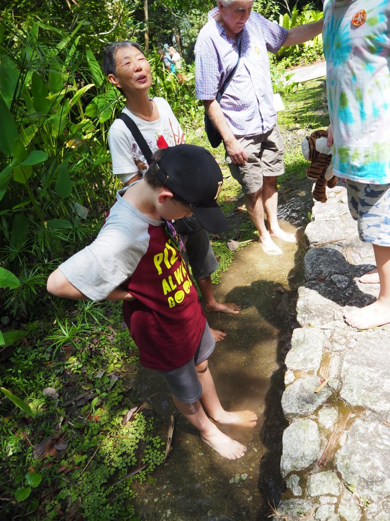 Our favourite area of the garden was a tea station with cups and an urn containing lemongrass, pandan and stevia tea where you help yourself and then sit near the stream and enjoy the sights and sounds around you. Once we’d finished our tea we went to stand in the stream which served as a natural fish foot spa. The tiny fish swarmed to your feet to give them a good clean!