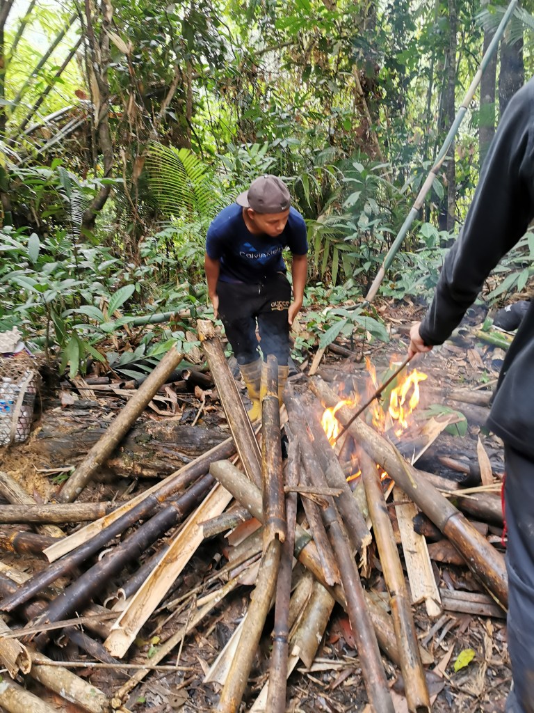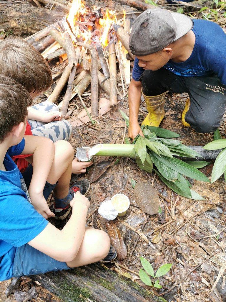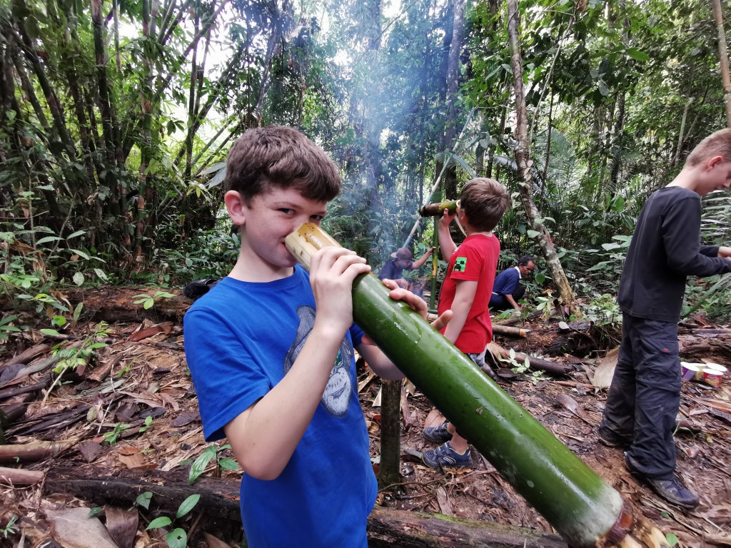 The guides carried with them just a machete and a simple wicker backpack that contained water for boiling and our lunch of pot noodles. When we stopped for lunch they made a fire with bamboo, and also set about cutting it in a number of different ways depending on what it was to be used for. Some was as a smoking torch to keep mozzies at bay, larger green stems were cut and the water was poured into it before placing it into the fire to heat up. The father cut down huge bamboo stems that contained fresh water and each of us were given our own to drink. When the water in the bamboo stem in the fire had boiled we made and enjoyed our pot noodles.
