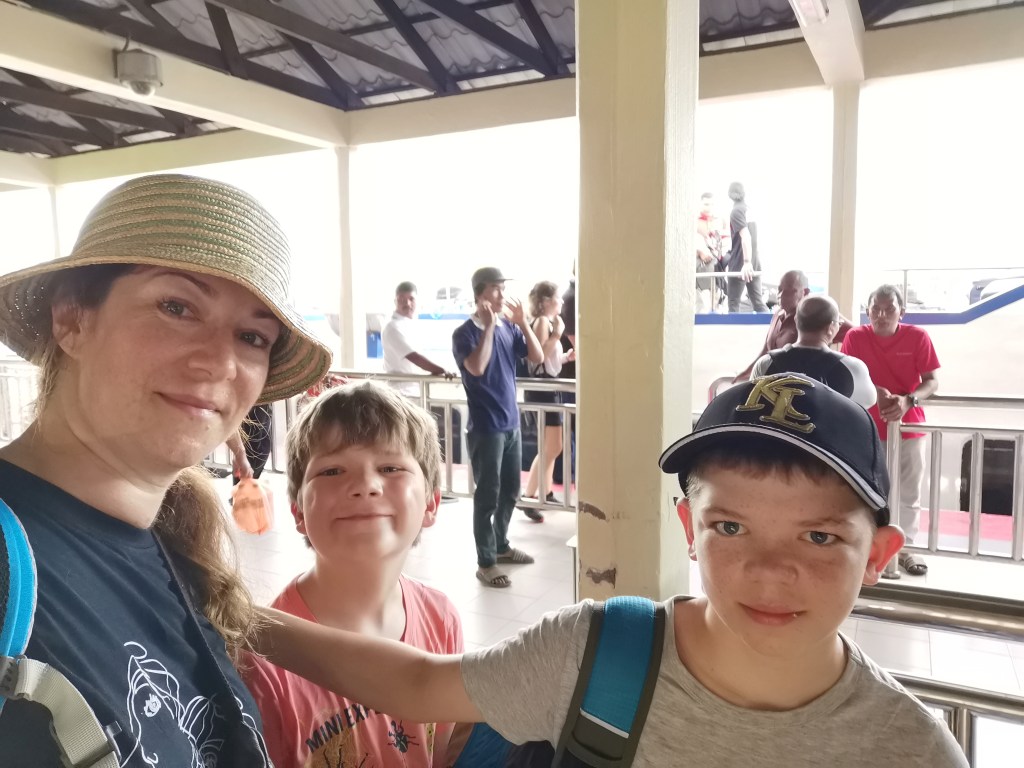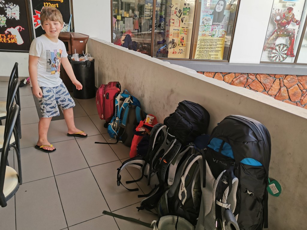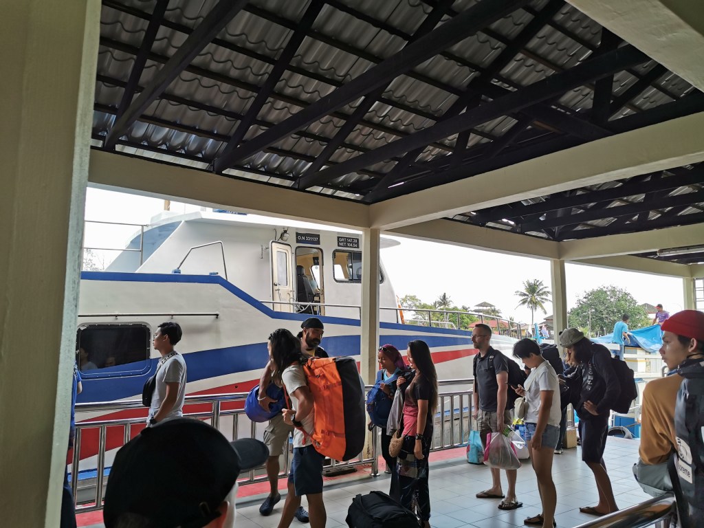 We got up the next day and this time the driver was available so we hopped in the minibus and headed, expectant and hopeful to the ferry terminal. This time the ferry was running and it was all a bit of a mad dash to collect boarding passes from one office, marine permits from another and then make your way across the road to the dock. Again Alfie went A over T and it was the extra rucksack he was carrying on his front that broke his fall and saved his face!